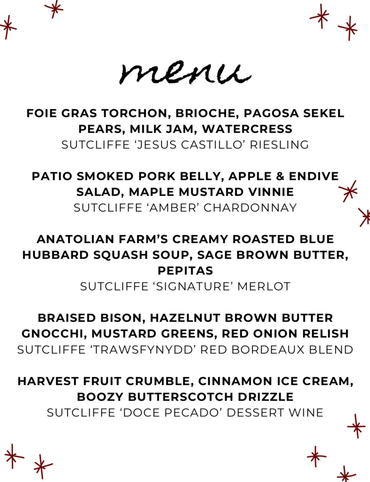5-courses with wine pairings 175/guest